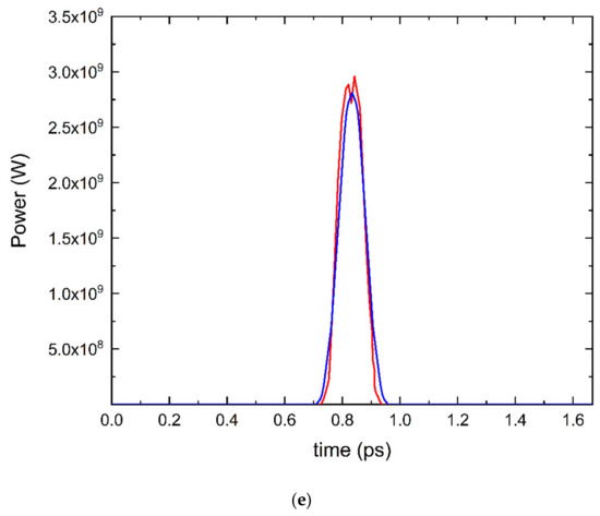 Figure 8e. The radiation power between this work (blue) and the 4GLS (red) showed a difference of approximately 4% in the single-beam oscillator system. The difference was due to the different formalism between our work with the higher-energy beam alone in the two-beam system and the Genesis simulation with a single-beam system, the number of grid points, and the mesh size, etc., in the simulations. The results for the fundamental mode were compared to those of the higher-order modes of