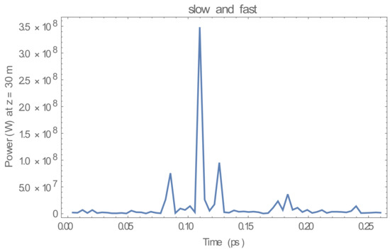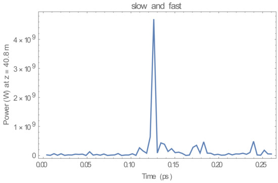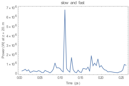 Figure 9. The time window was 0.26 ps in order to allow for slippage across the electron bunch in the simulation The temporal pulse shape at z = 10.0 m for the sum of the fundamental and higher-order modes of h = 1, 3, and 5 in the two-beam system with the elliptically polarized undulator exhibited a broad distribution of spikes, and this corresponded to the development of temporal coherence, as shown in