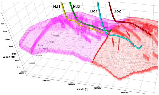 Grid representation of the Valdemar reservoir model with the North Jens sector model (magenta blocks) and the Bo sector model (red blocks), together with the considered production wells. The reservoir model is built in a commercial geological modelling software [18].