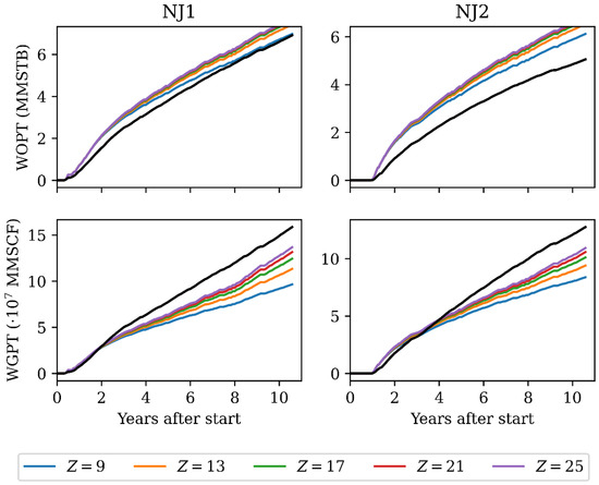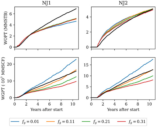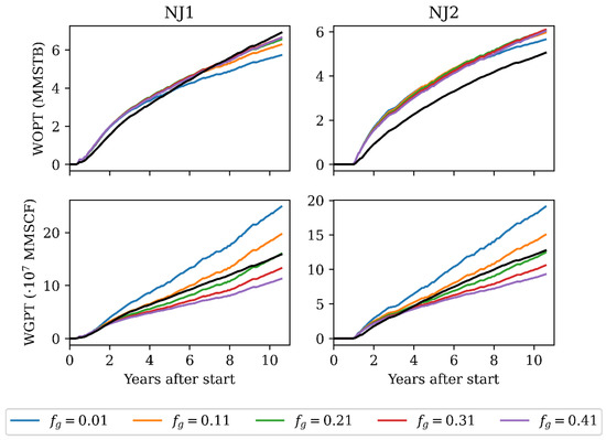 Another observation from Table 1 is that it is not always possible to get the best matches for the oil and gas produced volumes using a single choice of the oil and gas threshold ratios and (see, e.g., the results for NJ1). This suggests that one cannot match the production data by tuning the parameters of the relative permeabilities only.