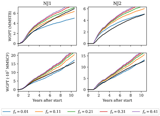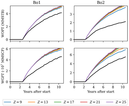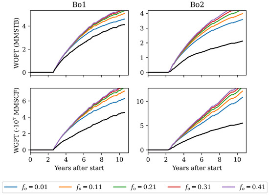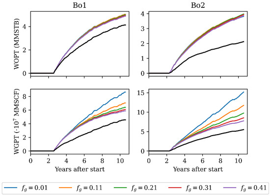 Within the relative permeability model of Section 3, the only way to diminish the oil production volume is to reduce the oil threshold ratio . However, even with the smallest oil threshold ratio considered, , which corresponds to large critical oil saturation , the corresponding produced volumes for the Bo wells are overestimated, see Figure 15. In principle, the produced volumes could be diminished even further by introducing corresponding permeability multipliers in the vicinity of the Bo wells or by modifying the well skin factors. However, this would require re-visiting the current geological model and the completions history, which is out of the scope of the present paper.