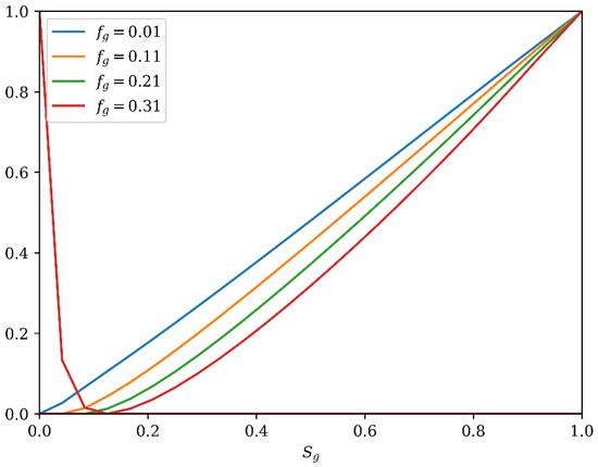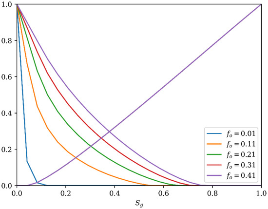 Due to the 10-fold decrease of the oil threshold ratio in Figure 13, as compared to Figure 4, the critical oil saturation for is significantly larger than the corresponding value of for . Note that an increase in eventually leads to the situation when and both gas and oil relative permeabilities are zero; no flow is occurring for larger values of .