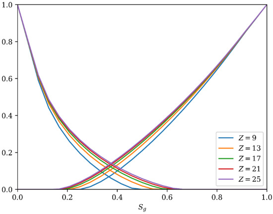 As indicated in [16], the higher values of the coordination number correspond to better connectivity of the porous medium, which leads to lower critical saturations for gas and oil. However, a comparison of Figure 4 and Figure 7, Figure 8, Figure 9 and Figure 10 reveals that the relative permeabilities are less sensitive to changes in than to changes in and , respectively.