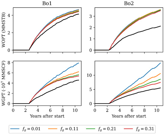 Applying the relative permeabilities in Figure 4 for the North Jens and Bo models yields the well oil and gas produced total volumes (termed WOPT and WGPT, respectively) as presented in Figure 5 and Figure 6, respectively. The results for both models are qualitatively the same. As expected, the lower and, consequently, the lower critical gas saturation correspond to higher gas production rates. The oil production rate remains essentially the same for all scenarios due to a fixed oil relative permeability curve.