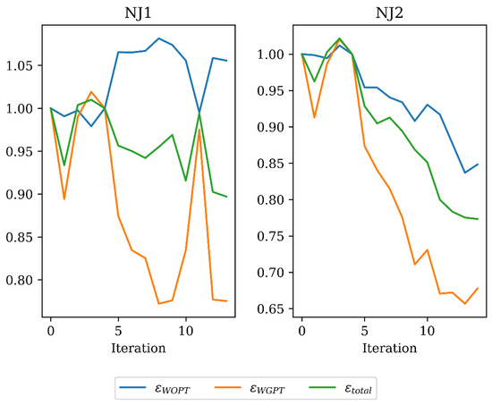 For the well NJ1, the used initial values differ significantly from those yielding best matches to the historical data, cf. Table 1. However, the results for NJ1 in Figure 16 indicate that the optimization algorithm is not improving the initial estimates to and in the course of iterations. The iterations are stopped when no further improvement is achieved after a prescribed number of iterations (10). On the other hand, we can improve the results for well NJ2. We argue that this behavior due to the well-known issue that the Nelder–Mead simplex algorithm can converge to a local minimum. Thus, the automated optimization cannot help improving the match of the production curves in this case.