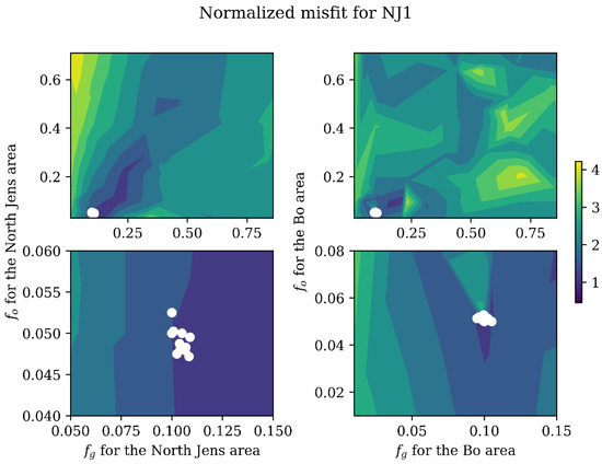 The misfit for the well NJ1 as a function of and (left graphs) and as a function of and (right graphs). The iteration steps of the Nelder–Mead simplex algorithm are depicted with white dots. The graphs in the bottom show zooms of the corresponding top graphs. The misfit is normalized to its value at the start of the Nelder–Mead iterations.