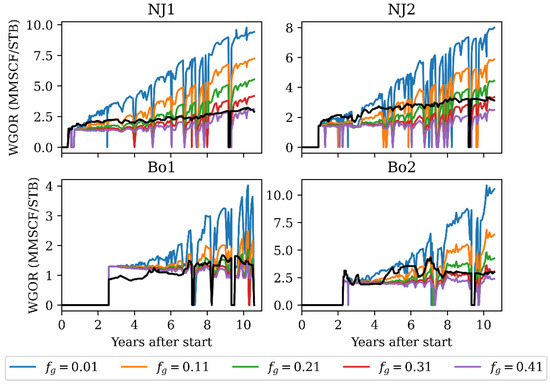 With the increasing values of and thus the increasing critical gas saturation , less free gas is flowing in the reservoir which results in less gas production and, consequently, smaller values of the GOR. For the value of the ratio , a reasonably good match to the historical GOR is obtained. For the North Jens wells, the corresponding gas production volumes match well the historical data as shown in Figure 5.