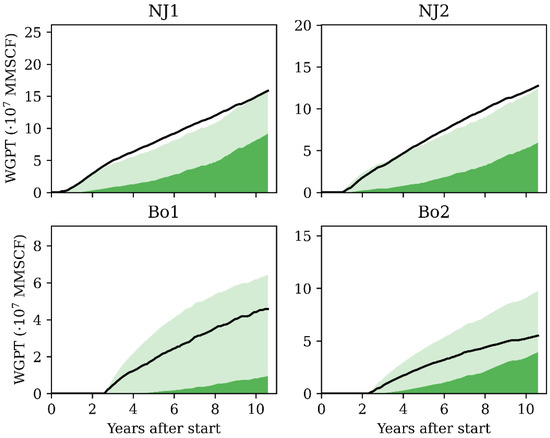 The produced gas volumes for the North Jens and Bo wells for the case of . Dark and light green colors correspond to the production of the free and solution gas at reservoir conditions, respectively. Black lines denote the historical gas production data.
