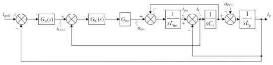 The control structure diagram of the grid-connected current and capacitor current double closed-loop control strategy of the single-phase LCL-type grid-connected converter is shown in Figure 2, where igref, iCref are the reference signals of the grid-connected current and capacitance Cf current, respectively. In Figure 2, iC is the current flowing through the capacitor Cf; uPCC is the voltage of PCC; Gig(s) is the transfer function of the outer loop grid connected current regulator, which is generally used by proportional resonance (PR) controller, as shown in Equation (1) [30]; GiC(s) is the transfer function of the inner loop filter capacitor current regulator, which is used to dampen the resonant peak of LCL filter and can be realized by simple proportional control.