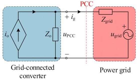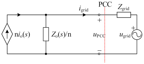 According to Equations (2)–(5), when igref = 0, the output impedance Zo(s) of the Norton equivalent circuit of LCL-type grid-tie converter can be deduced; and when uPCC = 0, the current source io(s) of the Norton equivalent circuit of LCL-type grid-connected converter can be deduced, as shown in Equations (6) and (7), respectively. Norton equivalent circuit of LCL-type grid-tie converter is shown in Figure 3.