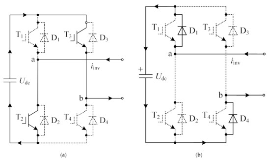 As power electronics have a finite turn-on and turn-off time, a dead-time needs to be set to prevent two switching devices in the same bridge arm from conducting simultaneously. The direction of current flowing from the converter to the utility grid is defined as a positive direction (iinv > 0), and the opposite direction of current is defined as a negative direction (iinv < 0). When iinv < 0, the current flows through IGBTs T2 and T3 when T2 and T3 are on, as shown in Figure 5a; the current flows through power diodes D1 and D4 when T2 and T3 are off, as shown in Figure 5b.