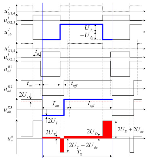 The gate signals waveform, output voltage waveform of the converter and error voltage waveform for iinv > 0 are shown in Figure 6. In the figure, UT and UD are conduction voltage drops of the IGBTs and the power diodes, respectively; Ts, td, Ton, and Toff are the switching cycle, dead-time, on-cycle and off-cycle of power electronic devices, respectively; ton and toff are the turn-on time and turn-off time of power electronic devices. uIG1,4 and uIG2,3 are the desirable gate signal of IGBTs T1T4 and T2T3, respectively; uRG1,4 and uRG2,3 are the actual gate signal of IGBTs T1T4 and T2T3 considering the dead-time, respectively; uIab is the desirable output voltage of the converter; uR1ab is the actual output voltage of the converter considering td; uR2ab is the actual output voltage of the converter considering td, ton and toff; uR3ab is the actual output voltage of the converter considering td, ton, toff, UT and UD. une is the error voltage, expressed as une = uR3ab − uIab.