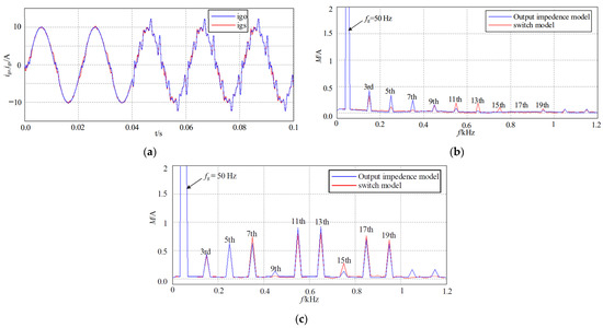 It can be seen from Figure 9 that the time domain waveforms of the grid-connected current of the two models are almost identical. It can be found from the frequency domain analysis that the two models are almost the same, except that the harmonic content of the grid-connected current of the switching model is slightly higher than that of the output impedance model due to the pulse width modulation. It can be said that the established output impedance model is correct, whether operating in the ideal power grid or distorted power grid, based on the previous theoretical analysis and simulation results. The output impedance model is equivalent to the switching model when the switching ripple caused by PWM modulation is not considered.