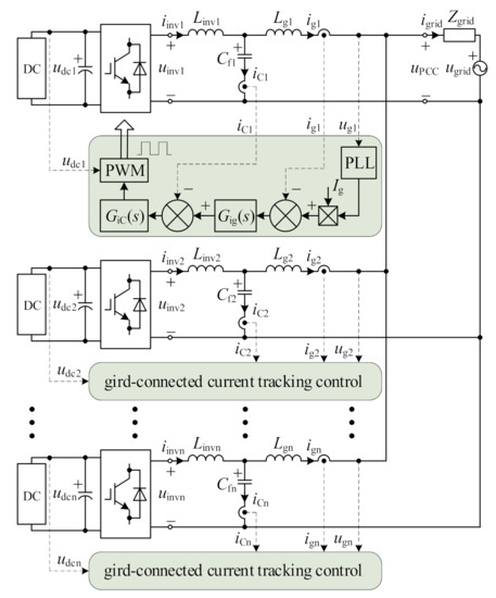 The structure of the LCL-type grid-connected converter cluster system in a weak power grid is shown in Figure 10. In this figure, n is the number of converters in the cluster; igrid is the total grid-connected current of the converter cluster; upcc is the point of common coupling voltage of converter cluster; udci is the DC bus voltage of the ith converter; uinvi is the output voltage of the ith converter; ugi is the grid interface voltage of the ith converter; Linvi, Cfi, and Lgi are the filter inductor of the converter side, filter capacitor, and filter inductor of the grid side of the ith converter, respectively; iinvi, iCi and igi are converter side current, filter capacitor current and grid side current of the ith converter; i = 1, 2, ···, n. Gig(s) is the transfer function of grid-connected current outer loop controller; GiC(s) is capacitor-current internal loop controller transfer function.