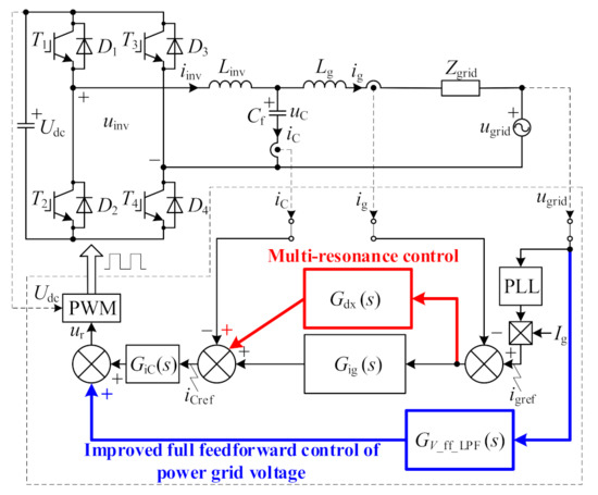 In this paper, the improved full feedforward of power grid voltage and multi-resonance control are combined to form a combined harmonic suppression strategy. The system structure of the LCL-type grid-tie converter is shown in Figure 15.