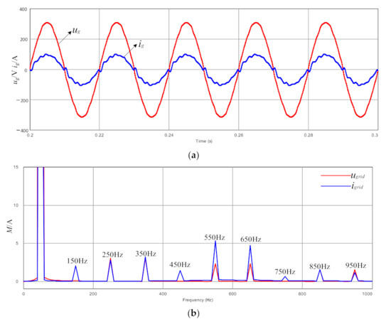 The time domain waveform of grid-connected current and its harmonic spectrum of the two models are shown in Figure 9.