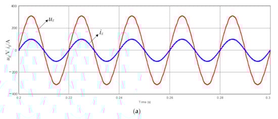 To verify the correctness and effectiveness of the output impedance model of a single-phase LCL-type grid-connected converter (Figure 8), it is simulated in PSIM and compared with the switching model (Figure 1) in time domain and frequency domain. Parameters of the single-phase LCL-type grid-connected converter are listed in Table 1. The grid-connected current of the switching model and output impedance model are expressed as igs and igo, respectively. The power grid voltage is injected with harmonic components when the time is 0.04 s, including the 5th, 7th, 11th, 13th, 17th, and 19th harmonics, and their magnitudes are 6%, 5%, 3.5%, 3%, 2%, and 1.5% concerning the fundamental part, respectively.