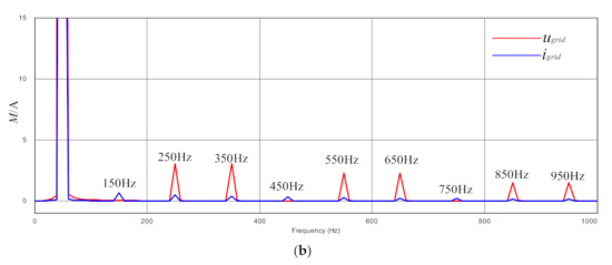 In a case where the power grid voltage contains harmonics, as shown in Figure 17, the grid-tie current distortion is serious as the converter cluster and the power grid both contain harmonic excitation sources close to this quasi-resonant frequency. Harmonic current amplitudes of 450 Hz (9th power frequency), 550 Hz (11th power frequency), 650 Hz (13th power frequency) and 750 Hz (15th power frequency) are amplified, of which 550 Hz (11th power frequency) and 650 Hz (13th power frequency) are amplified most seriously.