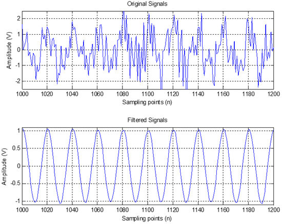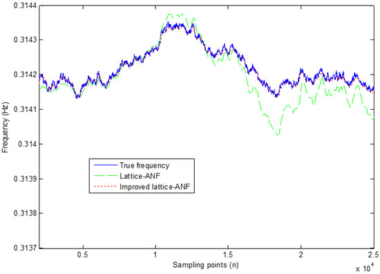 To evaluate the frequency tracking accuracy and filtering effect of the modified ANF, simulations are provided in Figure 1 and Figure 2. The parameters of specific signal models are given in Ref. [22]. It is observed that the modified ANF not only has good frequency estimating ability but also has good filtering effect. The presented method overcomes the problem that the original method cannot keep track of the frequency for a long time, and it retains high precision in terms of frequency estimation. It can be seen from Figure 2 that the notch filter can obtain better filtering effects even if SNR is low. In order to further highlight the advantages of the method, the original signal is processed instead by the filtered signal for extension processing.