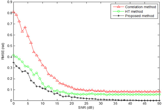 To validate the advantage of the proposed method, simulations for ANF, HT, the correlation, SGA, DTFT and the proposed method are tested, respectively. Simulation parameters are set as A = B = 1, f = 100 Hz, fs = 2000 Hz, and = 30°, and the additive white Gaussian noise is added into the signals. The performance of these methods is evaluated by Root Mean Square Error (RMSE), and each experiment is independently tested for 100 runs.