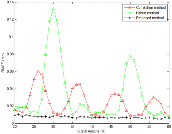 To validate the phase difference estimation performance of these methods under different correlation lengths, simulations are conducted at SNR = 20 dB, and the results are illustrated in Figure 4. It was observed that the estimation performance of HT and correlation methods varies periodically due to the influence of non-integer number of periods. Only when correlation length N is close to the integer number of sampling signal, HT and correlation methods have better precision of phase difference estimation. As shown in Figure 3 and Figure 4, it can be concluded that the proposed method overcomes the influence of non-integer period sampling, which also reflects the superiority of the method in this paper.