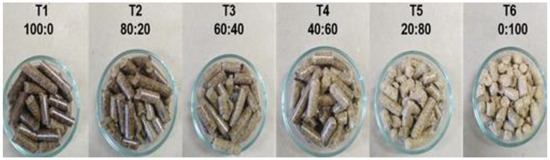 Pellets were made with a Mill model ZSLP-R300 flat die pelletizer with a capacity of 250–350 kg/h, following the recommendations of Núñez-Retana et al. [18]. After processing, the pellets were cooled room temperature, sieved to remove dust particles and impurities and stored in airtight plastic bags. The pellets were colored in different shades depending on the proportion of treatments (Figure 1).