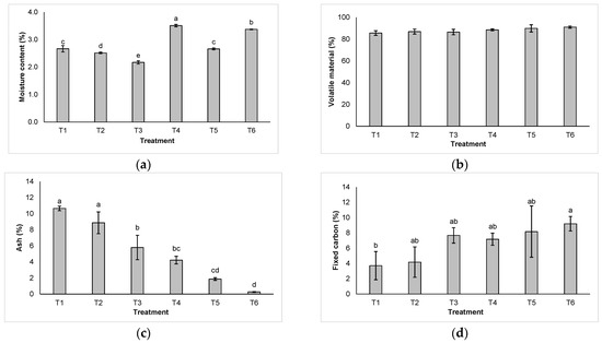 The moisture content was statistically different (p < 0.01) among the treatments. The highest value was found for T4 (3.51%), while the lowest value was found for T3 (2.17%) (Figure 2a). However, as can be seen in Figure 2b, there was a positive trend in moisture content as the percentage of pine sawdust in the treatments increased, starting with a value of 85.63% in T1 and reaching a maximum value of 91.10% in T6. The ash content was statistically different (p < 0.001) among the evaluated treatments; the lowest value occurred in T6 (0.27%), while the highest value was present in T1 (10.06%) (Figure 2c). Finally, fixed carbon also showed significant statistical differences among treatments, with T1 presenting the lowest value (3.71%) and T6 the highest value (9.20%) (Figure 2d).