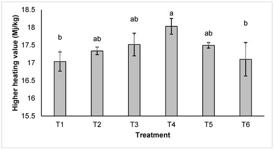 The calorific values revealed statistical differences among the treatments (p < 0.05) (Table 6). The highest value was recorded in T4 (18.03 MJ/kg), followed by T3, T2 and T5 with values of 17.52, 17.49 and 17–34 MJ/kg, respectively. In contrast, the lowest values were recorded in treatments T6 and T1 (17.10 and 17.04 MJ/kg, respectively) (Figure 3).