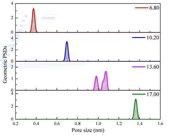 The geometric pore size distributions (PSDs) was shown in Figure 2 to investigate the pore morphology on step ahead. These data were obtained by Poreblazer v3.0 [33]. Helium was chose as the gas probe molecule. The results indicated that the PSDs peaks for the materials are narrow and independent due to the uniformly distributed pore sizes of slit pore. We found that the sum of the value of PSD peak and kinetic diameter of Helium (0.26 nm) is approximately equal to the corresponding layer distance. According to the IUPAC classification, N-NGM_3.6 and N-NGM_6.8 have ultramicropores (<7.00 Å), the other N-NGMs have micropores (7.00~20.00 Å) [34]. In summary, the pore spaces and diameters of N-MGNs were enhanced due to the increase of layer distance, particularly for N-NGMs NGM_3.4 and N-NGM_6.8. This can facilitate the gas adsorption and separation in gas-framework systems.