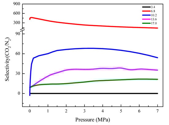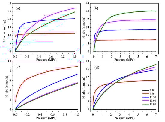 Figure 4c,d delineate the single component adsorption isotherms of N2 in the N-MGNs with different layer distance at 298 K. Moreover, the N-MGN_3.4 has no adsorption capacity in the pressure range of 0–7.0 MPa, because N2 molecules can’t get into the pore with relatively small pore size which is similar to CO2 adsorption capacity. For other N-MGNs, the single component adsorption of N2 follows the order of 6.8 > 10.2 > 13.6 > 17.0 at low pressure (0–1 MPa). This is because that the smaller pore size leads to the stronger interaction, which plays a critical role at low pressure. However, the adsorption changes upon the increase of pressure and it follow the consequence of 17.0 > 13.6 > 10.2 > 6.8 > 3.4 at 7 MPa. the type-I Langmuir adsorption behavior of CO2/N2 in N-MGNs demonstrate that the pore size of N-MGNs are typical micropores [43]. The result is consistent with the above-mentioned topology and morphology analysis of N-MGNs. Comparing with other materials, the N-MGNs could achieve preferable adsorption capacity of CO2 at declined pressure, indicating the ability of N-MGNs to separate CO2 from N2.