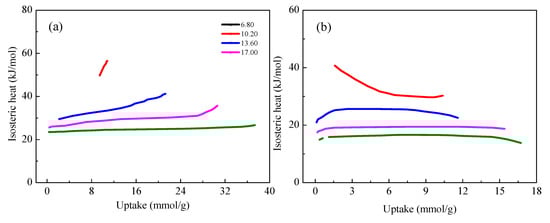 The isosteric heat of CO2 (a) and N2 (b) in the N-MGNs.