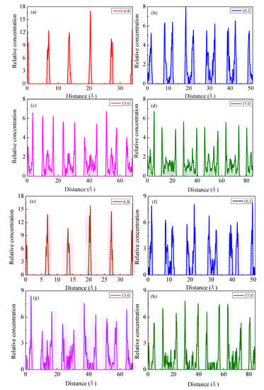 Figure 7e–h show that the relative concentration profiles of N2 for the N-MGNs have similar trend as CO2. When layer distance is narrow, only overlapped primary peaks can be seen. With the increase of layer distance, primary peaks separate and overlapped secondary peaks appear. When the layer distance reaches 1.70 nm, the integrated primary peaks, secondary peaks, and bulk region can be observed. However, the primary and secondary peaks of N2 are inferior comparing to CO2 due to the large kinetic diameter [50] and the stronger electric quadrupole moment of CO2 molecule.