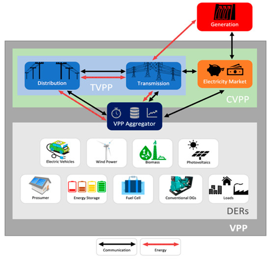 The VPP essentially depends on a TVPP for its existence and operation. It works and communicates mainly at the distribution-and-transmission-network level of the same geographical placement, as represented in green in Figure 2 [14].