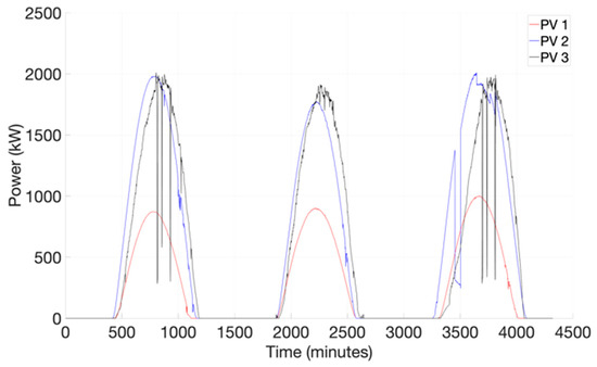Figure 4 shows the energy production of the three photovoltaic generators, connected to the 13.8 kV bar during three consecutive days. Data from the first two days are used to train the model. Two days are used in the model to buy, with the last day containing the error of the proposed model.