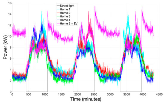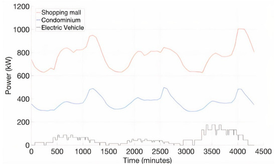 Figure 3 illustrates the VPP considered. It comprises three solar photovoltaic (PV) generators, three load sets (i.e., EV charging stations, a residential condominium, and a shopping mall, respectively) connected to a 13.8 kV bus, and three load sets (i.e., four households without EV, one household with EV, and one street light) connected to a 0.22 kV bus.