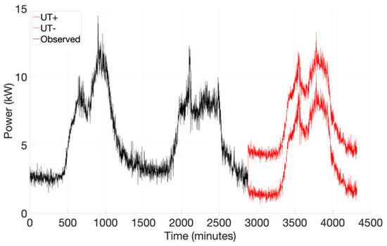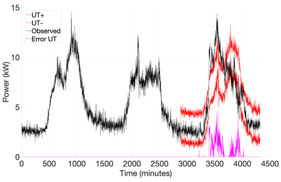To further illustrate the methodology, we randomly choose a load to present, and then all are similarly solved. The findings are presented in Table 1, below, with their proper comparisons. In Figure 8, the proposed methodology uses the UT. It applies to the minute historical data over the 2 days. The answer is a forecast that contains an interval range of UT+ and UT−, which is the predictability gap where the demand will be inserted.