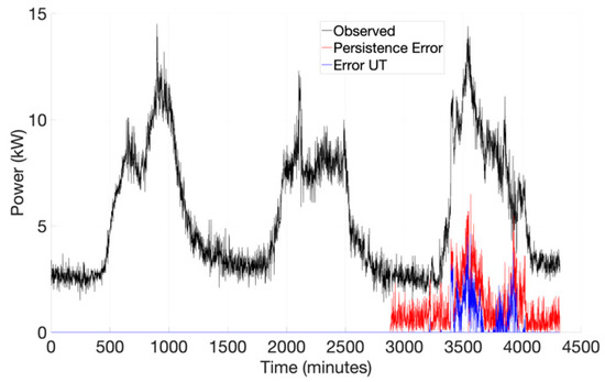 In Figure 12, one can visibly verify the low proportion of error of the UT method in relation to persistence. The errors presented in this specific case for house 1 connected to the 220 V system were 2.3% for the UT and 7.3% for persistence.