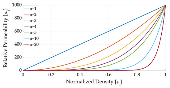 Different types of interpolation schemes are used in the literature, and a summary can be found in [26]. The exponential term in Equation (1) is usually referred to as a penalization coefficient because a steep interpolation drives the material property towards higher permeability. In other words, a sharper change in the material properties occur.