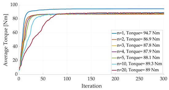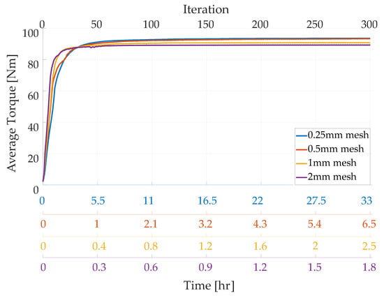 To assess the dependency of the optimization results on the penalization parameter, a number of optimizations has been performed on the 1 mm mesh model. The average torque versus the iteration number is given in Figure 8. The results indicate that the higher the penalization coefficient, the lower the convergence speed. In addition, there is a substantial drop in average torque when the penalization coefficient is higher than one.