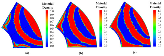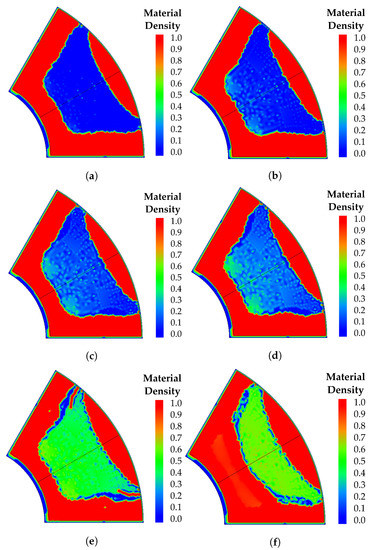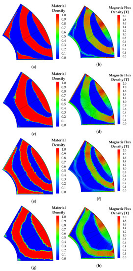 The material and flux density distributions of the final designs are given in Figure 5 to show the convergence to a reluctance-like structure. Even though a bounding outer frame is used, models with 0.5 and 2 mm mesh do not have a feasible mechanical connection to the frame. This points out the need to add further manufacturing feasibility constraints to the optimization process or the need for a final refinement stage in order to make the optimal solution feasible. Nevertheless, analyzing all the optimal solutions shown in Figure 5a–g, it is evident that there are negligible amounts of intermediate materials that do not represent any major challenges for shape definition.