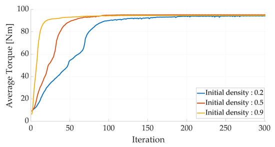 The effect of initial density has been studied in [21] for a magnetic shield, and only slight changes were observed in terms of objective value. Although the target problem is relatively complex in that case, similar results were obtained hereafter through optimizations conducted with initial densities of 0.2, 0.5 and 0.9 using the 1 mm mesh model. Slightly different average torque values of 94.3, 95.2 and 94.7 Nm were obtained for final designs with increasing starting density, as shown in Figure 6. Analyzing the results, it is clear that starting from a design space with more air, the time required for convergence is greatly increased. This can be justified by the low overall sensitivities obtained in the early iterations.