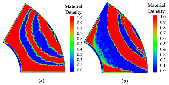 When material distributions of two models, as shown in Figure 10a,b, are compared, the model with the 1 mm mesh exhibits more intermediate materials than the model with the 2 mm mesh. This can be explained by the fact that the model had a higher number of variables and increased complexity of the objective functions, leading to slow convergence.