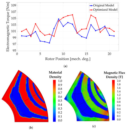 The obtained material distribution and corresponding flux density distribution are shown in Figure 11b,c. Electromagnetic torque versus output position is shown in Figure 11a for both the original and optimized machine. The average torque of the optimized machine is slightly increased from 100.8 to 102.3 Nm (+1.5%), while the torque ripple reduces from 7.3% to 6.5%. From Figure 11b, it can be clearly seen that the outermost and middle barriers have minor shape modifications while the innermost barrier is enlarged towards the shaft. This increase in the total ratio of air to iron thickness in the rotor is the reason for the torque increments due to better electromagnetic exploitation of the soft magnetic material. As a result, a minor performance increment is obtained by applying TO as a refinement tool. The underlying significance of this change in the performance is the fact that when using the parametric expression of the geometry, it is not possible to achieve such a shape, unless certain modifications are made to increase the geometrical degrees of freedom.