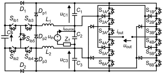 Four-level and five-level NPC converters are analyzed in [9,10,11,12,13]. The research demonstrates that the DC-link voltage balancing can be a major problem in such converters. To maintain the DC-link voltages sharing, various types of balancing circuits are proposed in [9,10,11,12,13]. The balancing circuit presented in [9] reinforces the natural balancing mechanism in the NPC-bridge composed of four-level legs. In [10], the balancing circuits based on switch mode converters are presented, and in [11,12], flying-capacitor circuits are proposed for the DC-link voltage balancing. SC-based balancing circuits are one of the proposed solutions for the NPC MLIs in [12,13,14,15,16,17]. Meanwhile, refs. [15,16,17] present a circuit where a switched capacitor can transfer energy between three capacitors of the DC-link. In [15], this concept is also extended to five series connected capacitors. A similar problem appears in the series connected battery banks, where the SC converters are analyzed as equalizers [18,19]. After the optimization, the circuit proposed in [15] can be used with a four-level single-phase NPC inverter to boost the total input, perform the voltage balancing and power decoupling, which is presented in this paper. In such a system, the front-end circuit can be controlled to charge the upper and lower capacitor from the middle capacitor of three series connected devices.