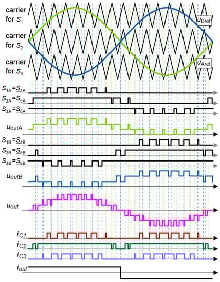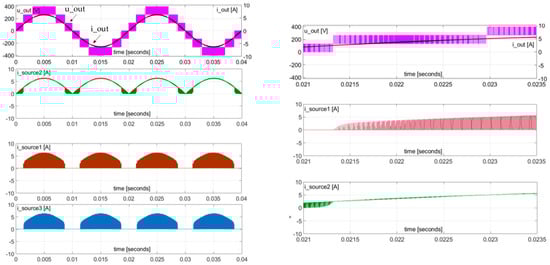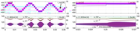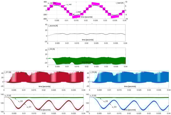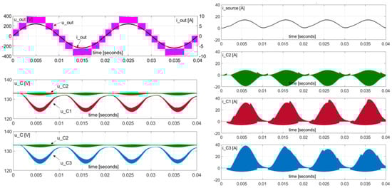 To demonstrate the operation of the inverter and energy required for particular DC-link capacitors, the inverter with three input voltage sources were analyzed (Figure 5a). Figure 6 presents the waveforms of the operation of the inverter with three input voltage sources and PD PWM. The results shown in Figure 6 confirms that the load of the internal source, connected to C2 capacitor, is the highest. For the lower modulation index of ma = Uref_max/Ucarrier_max, the discharging rate of C2 capacitor becomes significantly higher than the discharging rate of the C1 (or C3) capacitor. For ma = 0.6, 67% of power comes from the C2 capacitor and for ma = 1, PC2/Pout it is over 0.41 (Figure 5b). These results show that the use of the classic PD modulation is favorable when the source is connected to the middle DC-link capacitor (C2). The energy required for the maintenance of voltage on the C1 and C3 capacitors is transferred by the AIVB. In the analyzed case of operation of the inverter (UDC = 400 V, Uout = 230 V) the auxiliary circuit AIVB transfers approximately only 50% of power to the C1 and C3 capacitors.