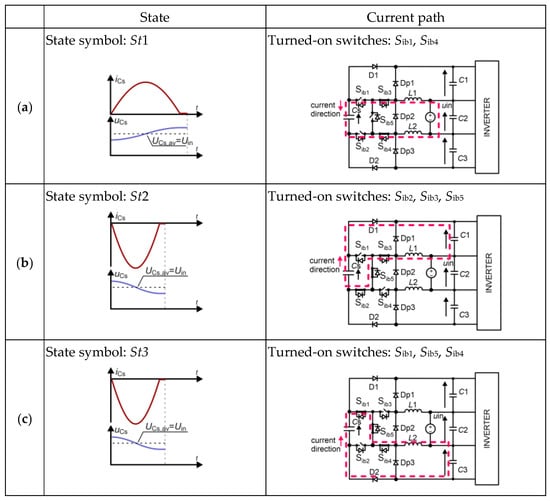 The basic control principle of the AIVB assumes the use of switching states which charge the switched capacitor from the source and discharge to one of the DC-link capacitors C1 and C3 (Figure 3). It is conducted in the following order with the frequency fsw: