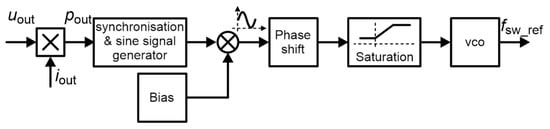 From the relationship (3), it is seen that a variation of the switching frequency (fsw), in the range below the rated frequency, allows to control the AIVB’s power. With adequate synchronization of the output’s instantaneous power, this allows for a reduction in the double grid frequency from the source’s current. Figure 4 presents the concept of the closed control system for the power synchronization and double frequency reduction.