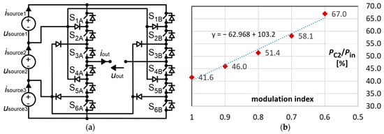 (a) the test circuit of the inverter with three input voltage sources, and (b) power of DC-link middle source (connected to C2 DC-link capacitor) in the seven-level inverter (Figure 1) with the PD-PWM versus the modulation index.