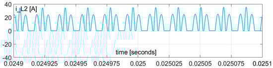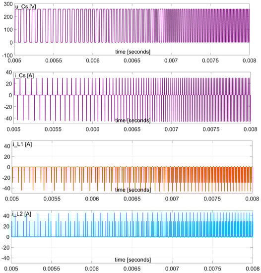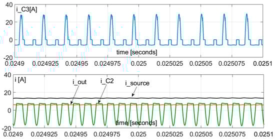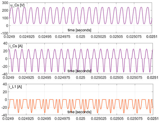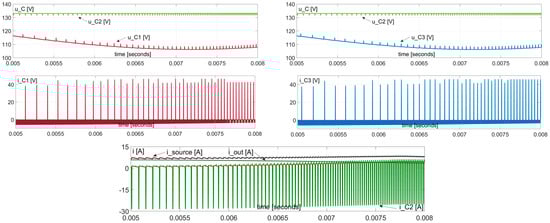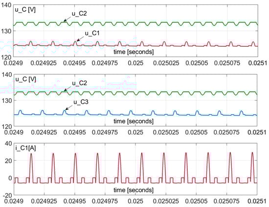 The AIVB’s operation is presented in Figure 8 and Figure 10 with details (25 μs/div). It is a fragment of the waveforms when the load of the AIVB is the highest. Resonant charging and discharging of the DC-link capacitors with the use of a switched capacitor is clearly visible. In every switching period the C2 capacitor is discharged and the C1 or C3 capacitor is charged. The frequency of pulses of the current in the C2 capacitor is two times higher than in the C1 and C3 (Figure 8).