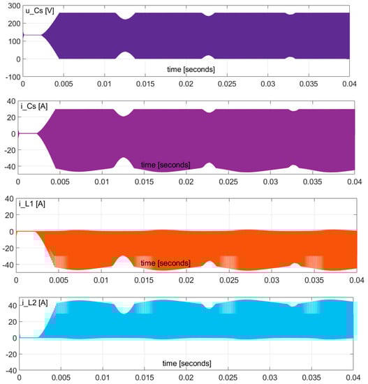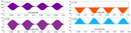 For the demonstration purpose, the following range of DC-link capacitor C1 and C3 voltage is assumed: UC1max = 133 V and UC1min = 100 V. In such a case, the relationship (6) allows to calculate the capacitance C1 = C3 = 421 μF. In further tests, the DC-link capacitances are 500 μF for simulations (Table 1) and 470 μF for experiments (Section 4). Such values of capacitances allow to clearly demonstrate phenomenon of AC energy storage. To operate with lower voltage ripples, larger capacitance of C1 and C2 DC-link capacitor banks is required, according to the relationship (6).
